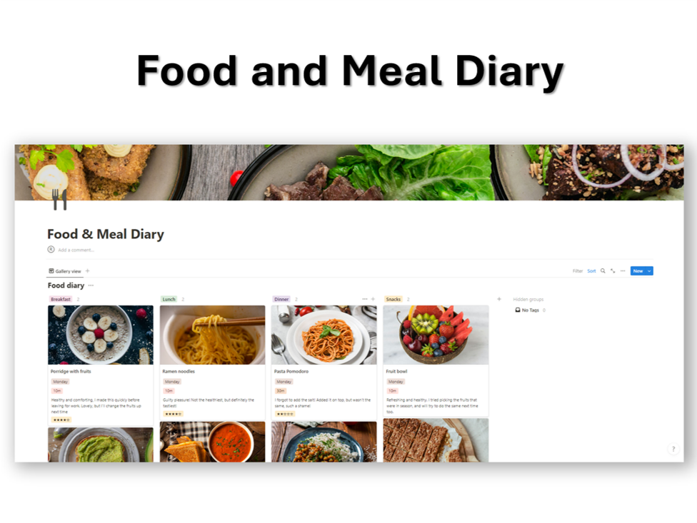 This simple food diary allows you to journal your meal and snack intake in a fun and aesthetic way. You can use it to keep track of important factors like how long a recipe takes to make, or how much you liked a new food you tried. You can even add photos of your food to make this diary look all the more aesthetic - which is of course one of the most important things ☺